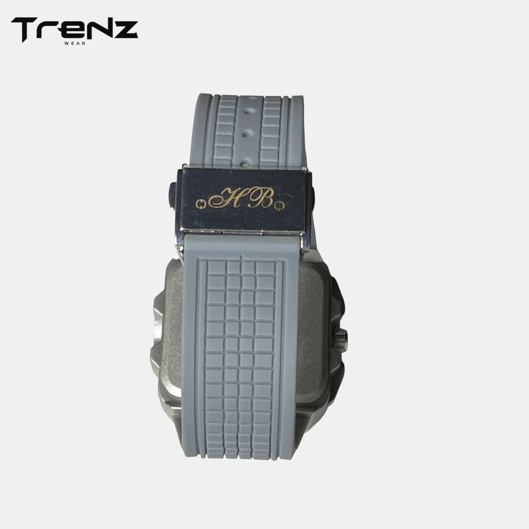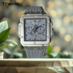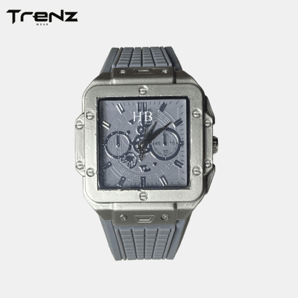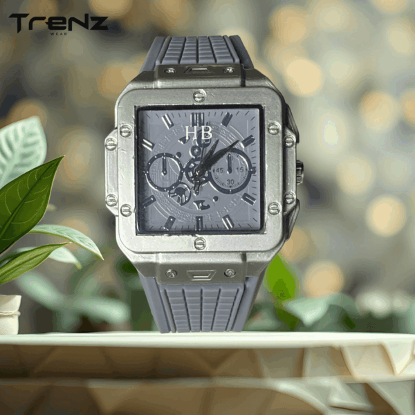 Make a bold statement with this luxury-inspired square chronograph watch in an elegant grey edition. The stainless-steel case, highlighted with signature screw detailing, reflects strength and modern craftsmanship. Its sleek grey dial, paired with contrasting Roman numeral markers and multifunction sub-dials, delivers both style and precision.