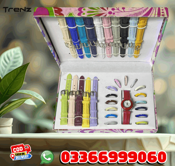 Add color and versatility to your everyday style with this multi-color interchangeable strap watch set. Designed for those who love variety, this set includes a classic round-dial watch with multiple vibrant straps and colorful bezels, allowing you to create endless style combinations.